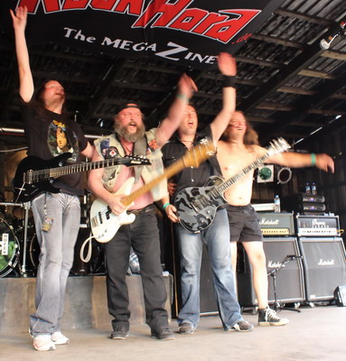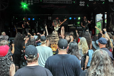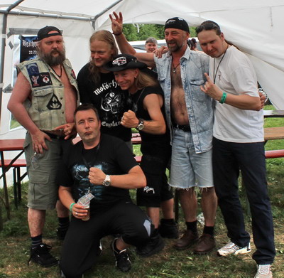 26.07.2013, Brande, H.O.A. Das Headbangers Open Air, kurz H.O.A. genannt, gehört zu den bekannteren und angesagteren Festivals des Sommers. Hier zu spielen ist ein ganz großes Ding, und im Sommer 2013 durften auch wir hier spielen. Geilomat! Wir möchten uns hier einmal mehr bei unserem Manne bedanken, der uns diese tolle Möglichkeit erst eröffnet hat... Danke! Am Freitag, den 26.07.2013 waren wir für 14.05h aufs Billing gepackt worden, wodurch wir erst als dritte Band, und nicht, wie eigentlich erwartet, als erste Truppe auf die Bühne sollten. Gegen 13.45h begannen wir damit, unsere Klamotten auf die Bühne zu schaffen. Hier erwartete uns bereits ein Publikum, welches aus vollem Hals unsere Songs "Warriors Tune" und "Stormclouds" sang. Wie geil war das denn bitte? Sowas hatten wir noch nie erlebt... Dann der Soundcheck, zu dem wir (wie immer seit ca 10 Jahren) "Breaking the law" spielten, und die Message war klar: THIS IS METAL !!! Da einige wohl dachten, das Priest-Cover wäre der Opener unserer Show, merkten wir nur kurz danach an, daß "wir jetzt gern mal loslegen würden", und ab ging es durch ein 45minütiges "Allerbest Of"... Meine Fresse, wurden wir abgefeiert! Irgendwie schienen die Zuschauer fast jeden Song mitsingen zu können, und selbst Patsche und Jensis "Rudi Schenker meets ZZ Top" Ballett-Einlagen zauberten doch lächelnde Gesichter auf harte Metallervisagen - und lang verstaubte Luftgitarren wieder ans Tageslicht. Dann, bei "Master of the Kings", endlich der befürchtete "Blackout": Die Nebelmaschine stand wohl auf 12/10, und so wurde unser Nico am Kit so dermaßen vernebelt, daß er nach dem Intro den Song kurzerhand abbrechen mußte. Gute Entscheidung, ehe man sich selbst mit dem Stick ins Auge piekst... ;-) Als sich der Nebel dann verzogen hatte, zogen wir den Rest unseres Sets wieder wie gewohnt runter. Einziges Schmankerl war vielleicht noch Jensi, der "Warriors tune" in der Hitze des Gefechtes euphorisch als "Warriors of the King" ansagte... Aber auch unter diesem leicht verwirrenden Arbeitstitel gingen die Zuschauer so gnadenlos mit, als seien wir die letzte Band des Festivals. Viel zu schnell war unser Gig dann wieder zu Ende. Die tapferen Zuschauer allerdings, die uns schon reingesungen hatten, sangen uns auch wieder raus. Da wir "Stormclouds" nicht gespielt hatten, brachten sie uns dessen Refrain mit solcher Hingabe entgegen, daß Jensi, fast zu Tränen gerührt, mit ihnen zum Abschluß noch ein paarmal jenen gröhlte. Das war ein wirklich affengeiler Gig, bei dem wir zum krönenden Abschluß auch noch ca 60 CDs in nur 3h verkauften. So etwas verblüffte selbst den erfahrenen Merchandiser... :-) Danke an die Crew vom H.O.A., danke an Jürgen und danke an Manne, daß wir diesen unvergesslichen Tag erleben durften! METAL !!! Da einige Magazine unseren Gig nicht ganz so toll fanden, wie wir, gibt es in den Edges noch eine weitere Betrachtung. |