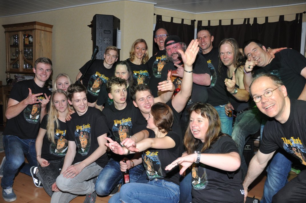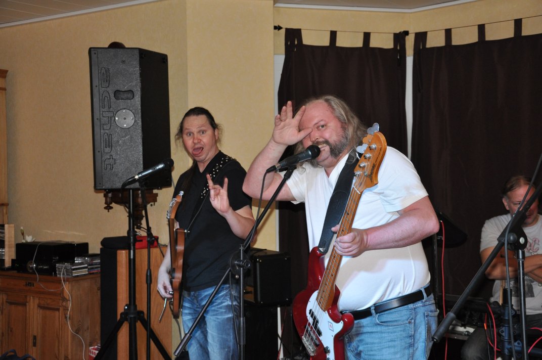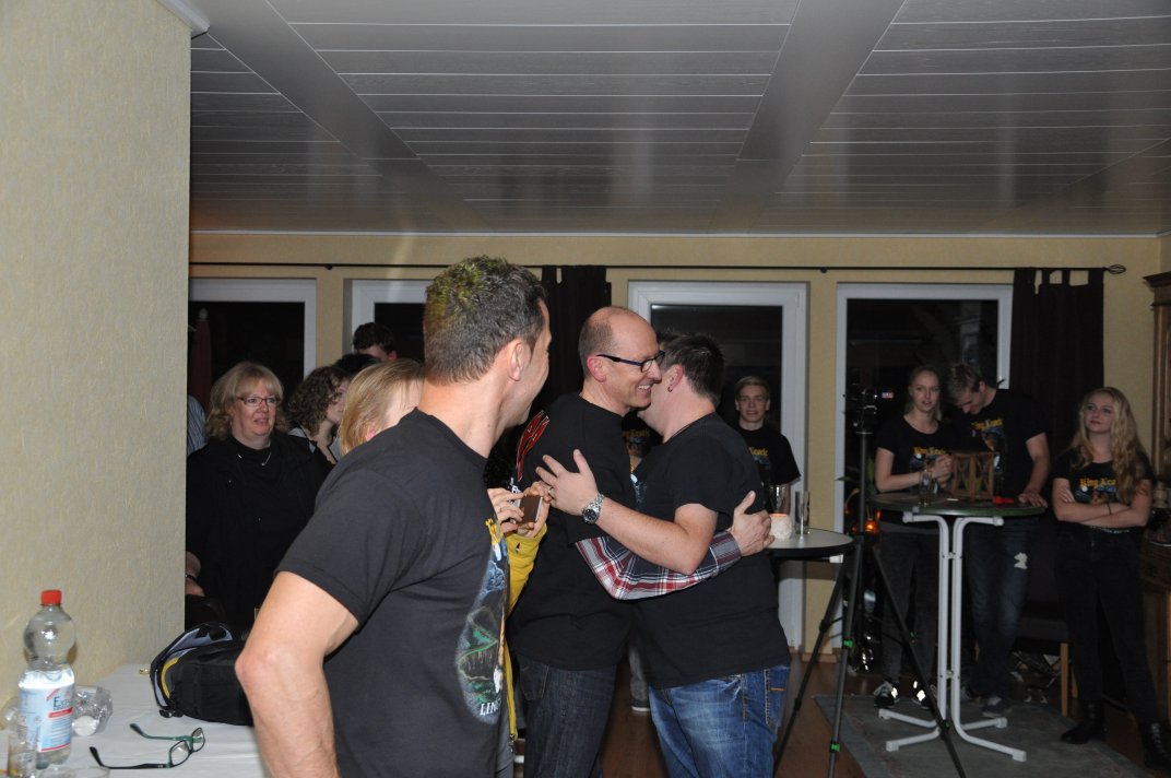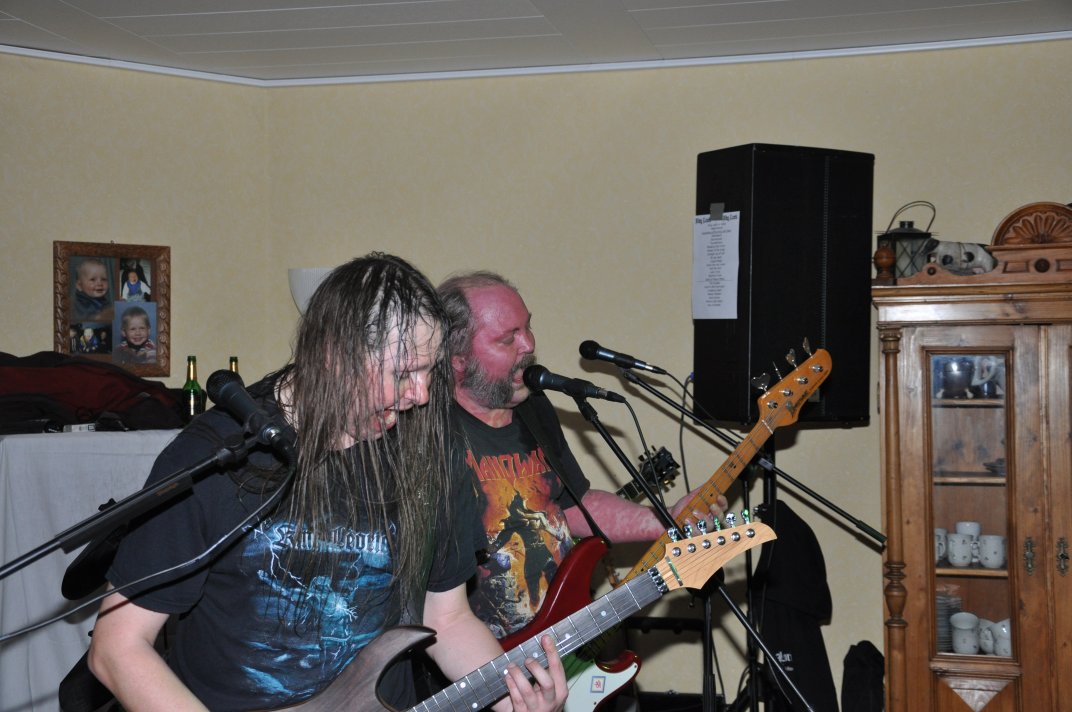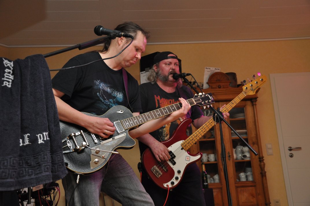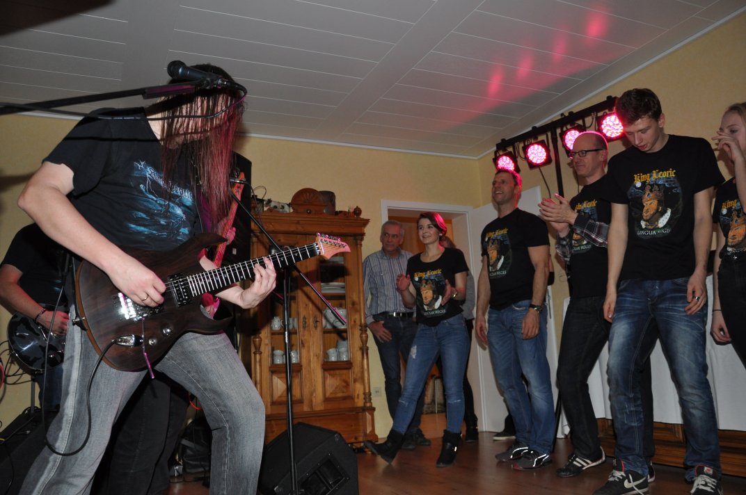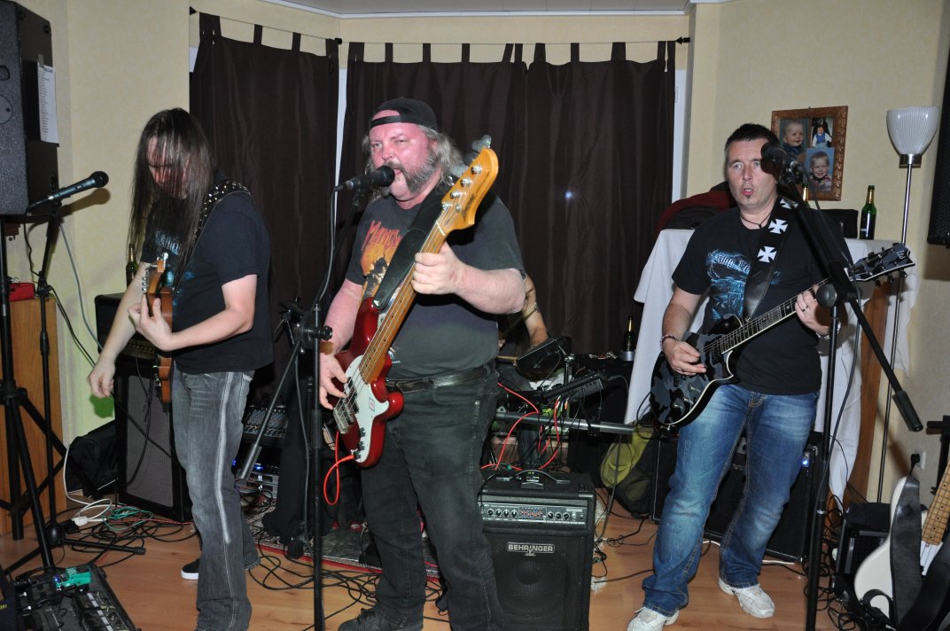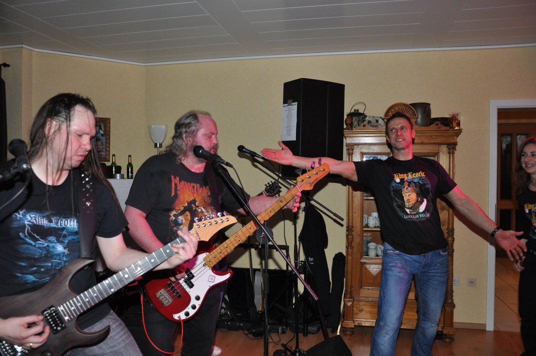 14.11.2014, Beerdrinkers and Hellraisers Wasbüttel "Überraschungsparty"... Wer hat noch nicht von diesem Brauch gehört, ein Geburtstagskind damit zu überraschen, daß, wenn es nach Hause kommt, all seine Freunde bei ihm zu Haus auf der Matte stehen, feiern wollen bis der Arzt kommt, und auch noch selbstständig für Speis und Trank gesorgt haben? Dieser Brauch ist so schön, wie er irreal ist, da man hierzu ne Menge zu organisieren hat. Wenn man es das allerdings gut hinbekommt, dann ist die Überraschung natürlich um so schöner. Solch eine Überraschungsparty sollten wir hier in Wasbüttel bespielen, einen 50.Geburtstag, an dem man das Wort "Fünfzig" zwar gar nicht erst in den Mund nehmen sollte, allerdings niemand genau wußte, warum eigentlich nicht... :-) Entsprechend war das Motto, welches auch auf den eigens hierzu verschönerten "Lingua Regis" Shirts prangte dann auch: "No fear for fifty"... Es war halt alles ein wenig heimeliger auf diesem Gig. Alles sehr privat, und irgendwie kamen wir uns alle wie kleine Verschwörer vor, die hinter vorgehaltener Hand in einem fort heimlich vorfreudig kicherten. Micha, einer der besten Freunde des Geburtstagskindes Rainer und einer der Hauptorganisatoren der Fete, brachte es auf den Punkt: "Ich freu mich, wie´n Schnitzel...!". Gegen 16.00h rückten wir mit unserem Geraffel an, um uns im Wohnzimmer des Jubilanten erstmal breit zu machen. Der Sound stand dann gegen 17.30h, selbstverständlich gingen dabei wieder diverse Kabel kaputt, die wir in die magische Kabelkiste warfen, aus der wir als Ersatz Kabel fischten, die das letzte mal kaputtgegangen und in der Kabelkiste gelandet waren, aber nun wieder funktionierten. Von selbst... :-) Magische Kabelkiste eben... :-) Um 18.15h war es dann soweit, der Geburtstags-Rainer rollte auf seinen Hof, den Feierwütigen direkt in die Arme. Er war von seiner Kollegin tatsächlich bis spät am Abend mit irgendwelchen Terminlichkeiten hingehalten worden, und es hätte uns nicht verwundert, wäre er mit ner richtigen Kack- Laune aus seinem Auto geklettert. Wer bleibt Freitag Abend schon gern länger, als er muß? Doch bevor Rainer noch irgendwas sagen konnte, legten sein Sohn, seine Freunde Micha und Uwe, sowie dessen Sohn im Hof schon mit einem einstudierten "Die for Metal" los. Quasi "die andere Band" des Abends. Cool. Damit verfiel Rainer erstmalig in den Zustand der Sprach- losigkeit vor lauter Freude. Nach dem kurzen Intermezzo der Band ging der Feiertroß geschlossen auf Rainer los, was ihn immer wieder der Sprachlosigkeit auslieferte. Der erste Teil der Überraschung war also schonmal geglückt. Nun kamen wir an die Reihe. Während der "Hof-Band" hatten wir mucksmäuschenstill im Wohnzimmer verharrt, auf unseren Einsatz wartend. Jetzt ging ich raus, mit dem Bass über der Schulter und einem Shirt für Rainer in der Hand. Man muß wissen, daß Rainer unsere Truppe schon einige male live gesehen hat, uns also kennt. Daher überblickte er schnell die Situation, und fandt sogar die Sprache wieder, als er mich erblickte: "Ach Du Scheisse...!!!", klang es aus seinem Mund, und selten habe ich dieses böse Wort mit so freudigem Unterton gehört... :-) Nun bat ich den Hausherren, mir in sein Wohnzimmer zu folgen, und mit seinem Eintritt brach unser Reigen bunter Metal-Melodien über ihn und seine ihm folgenden Gäste herein. Jetzt kannten Freude und Erstaunen keine Grenzen mehr. In zwar gemäßigter, aber immer noch dröhntauglicher Lautstärke walzten wir unseren Set durch Rainers Wohnzimmer. "Wir", das waren an diesem Abend Nico, Accy, Jensi UND Patsche, der zwar eigentlich 4 Wochen vorher in Eschwege seine letzte Show gespielt hatte, aber heute trotzdem nochmal mitmischen wollte, da er zufällig noch in Deutschland weilte. Nur zum dritten Track "Guardians of the king" gesellte sich statt Patsche der Gitarrist der "Hof-Band" Uwe zu uns, um uns an der Rhythmus-Klampfe zu begleiten. Uwe ist Rainers Freund und Nachbar, und für Rainer war es die reinste Freude, Uwe endlich mal in einer Band zocken zu sehen. Uwe ist nämlich ein wirklich guter Gitarrist, der sich aber nicht durchringen kann, einer Band beizutreten... Danach folgten knapp anderthalb Stunden Programm von und mit uns, wobei das Publikum teilweise schon recht steil ging. Und das war nicht unbedingt zu erwarten gewesen. Trugen zwar fast alle Anwesenden jene modifizierten "Lingua" Shirts, so waren die meisten musikalisch mit Sicherheit nicht im Old School Heavy Metal beheimatet... Und so waren es denn zum Ende wieder viele, die zugaben, "mit Metal nichts zu tun zu haben", uns aber "voll geil" zu finden... Freu... Micha freute sich mittlerweile schon wie ein XXL-Schnitzel, und die ganze Bude bebte in unserem Sound. Alles sprang, hüpfte, gröhlte... - und als wir zum Ende dann auch noch den alten Flippers-Gassenhauer "Die rote Sonne von Barbados" intonierten, begannen sogar einige, zu tanzen... Job gemacht, würde ich sagen. Nach unseren anderthalb Stunden waren wir fix und alle. Wir hatten eine super Show gegeben, hatten noch einmal Patsche an unserer Seite, und hatten nun nur noch Durst. Welch eine Feier! Wir blieben nun noch als Ehrengäste auf Rainers Party, und tranken manch guten Schoppen mit unseren neuen Freunden. Gegen 3.00h nachts ging es dann ins Hotel. Wasbüttel Du hast gerockt! Und Rainer: Du hast echt coole Freunde! Prost! PS: Spät, gegen 1:00h, als Patsche schon längst weg war, bestand Rainer darauf, daß Accy Rainers Klampfe noch mal live checkte. Also hobbelten wir mit voller Runkel nochmal schön auf und dröhnten volle Pulle noch einmal 4 Tracks in die Nacht... DAS war echter Rock´n´Roll, auch wenn es am nächsten Tag mündliche Verweise aus der direkten Nachbarschaft gab. Na, wenigstens waren die Schutzgeister nicht da... Rainers Klampfe ist jedenfalls spitze... :-) |