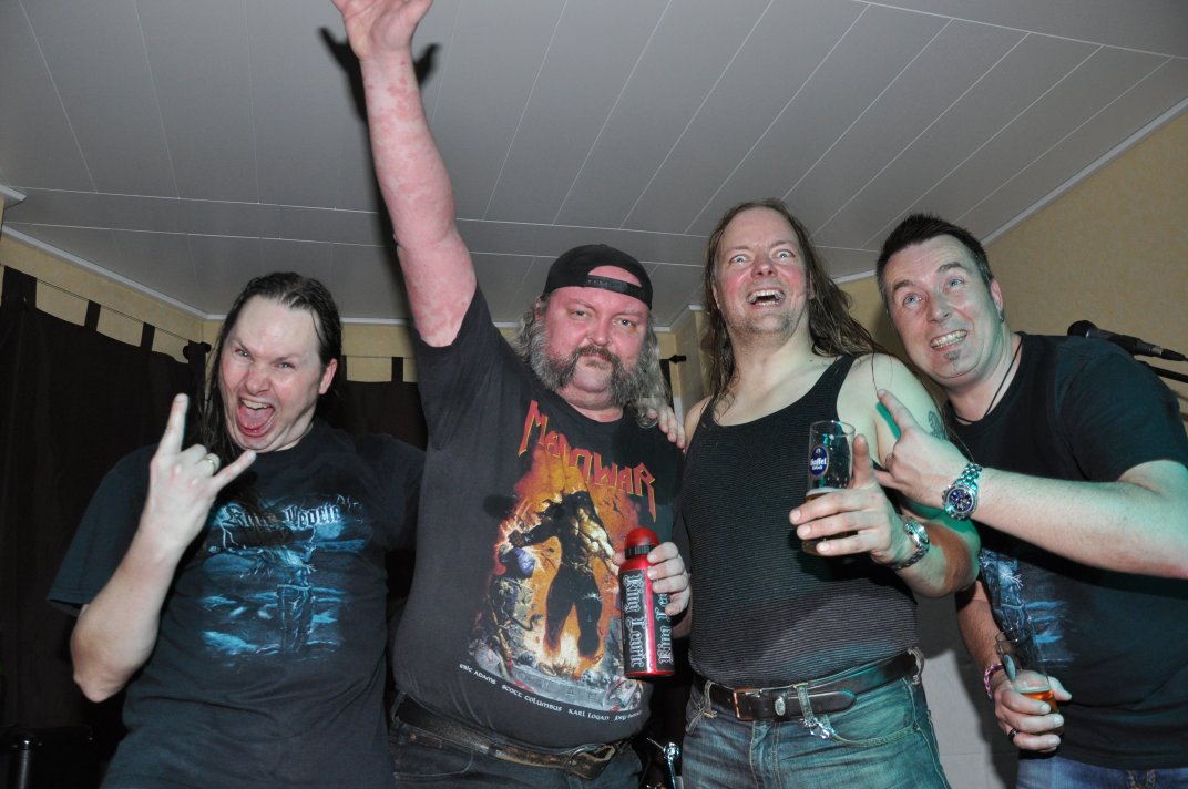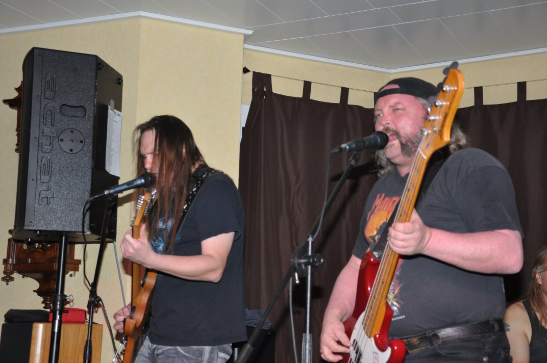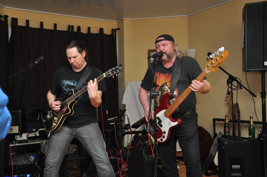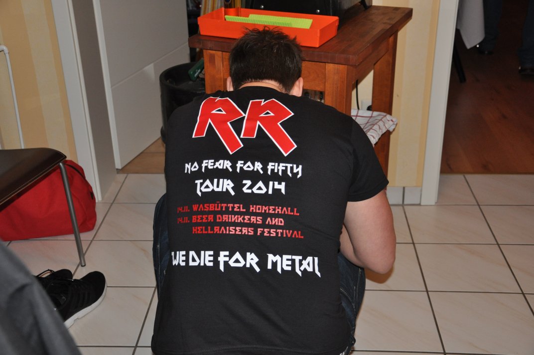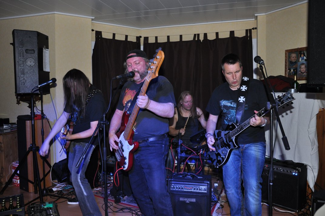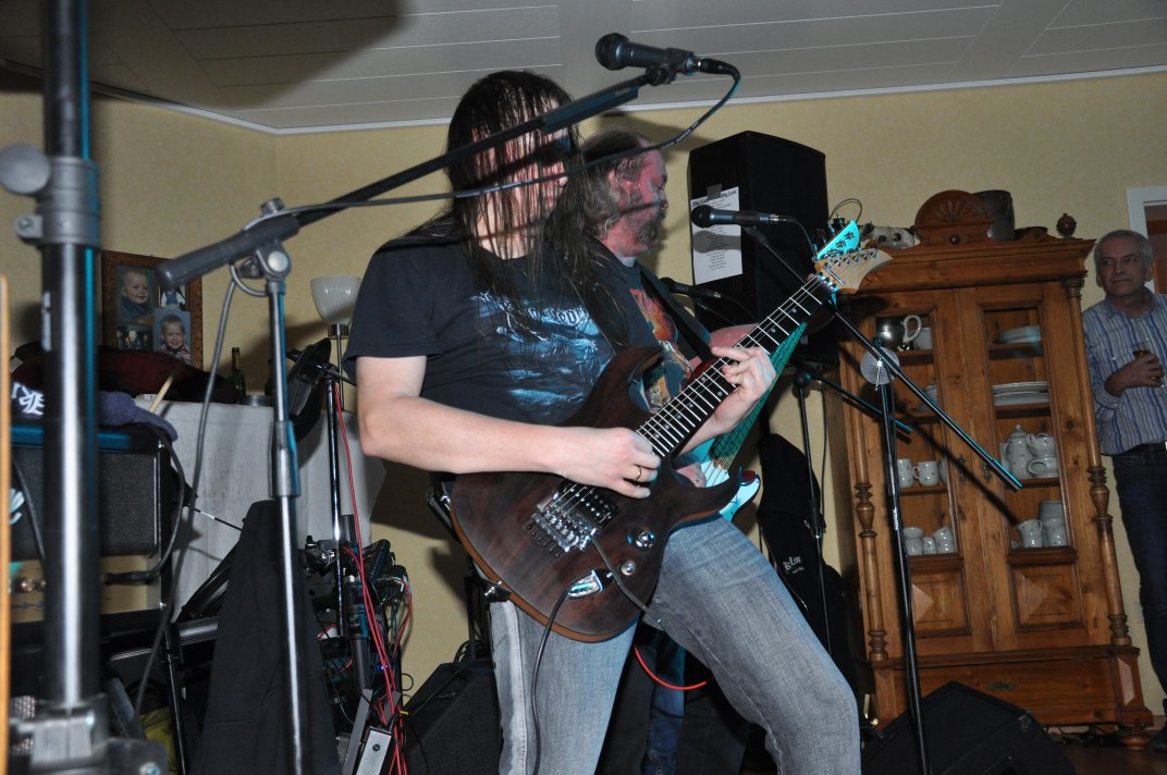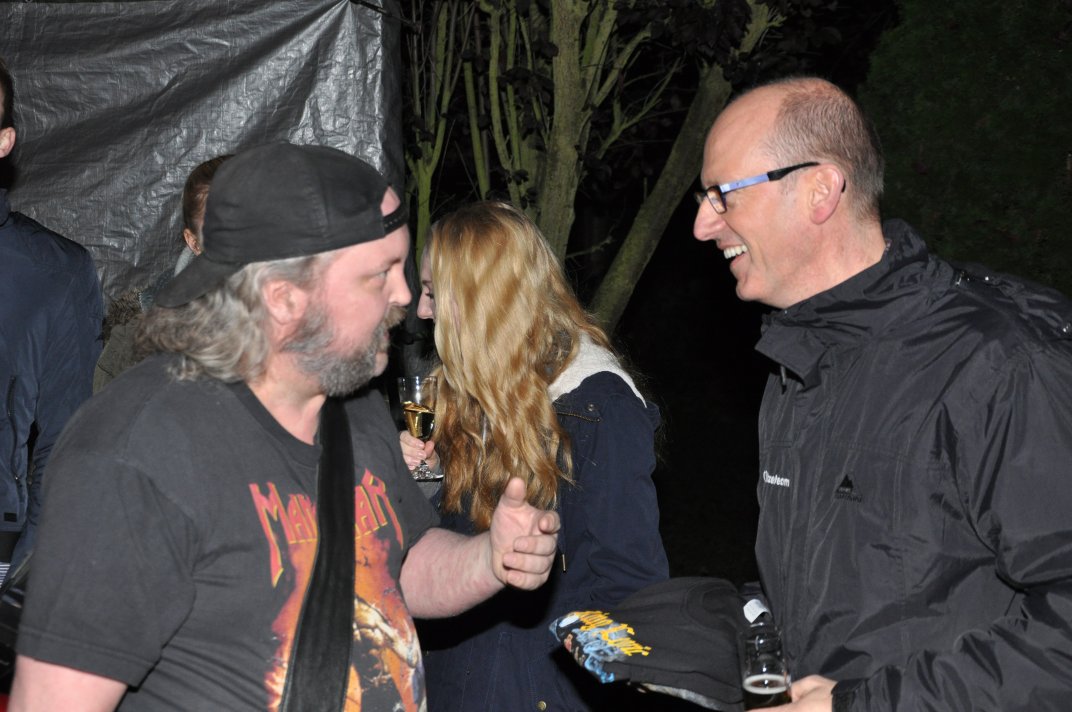 14.11.2014, Beerdrinkers and Hellraisers Wasbüttel "Überraschungsparty"... Wer hat noch nicht von diesem Brauch gehört, ein Geburtstagskind damit zu überraschen, daß, wenn es nach Hause kommt, all seine Freunde bei ihm zu Haus auf der Matte stehen, feiern wollen bis der Arzt kommt, und auch noch selbstständig für Speis und Trank gesorgt haben? Dieser Brauch ist so schön, wie er irreal ist, da man hierzu ne Menge zu organisieren hat. Wenn man es das allerdings gut hinbekommt, dann ist die Überraschung natürlich um so schöner. Solch eine Überraschungsparty sollten wir hier in Wasbüttel bespielen, einen 50.Geburtstag, an dem man das Wort "Fünfzig" zwar gar nicht erst in den Mund nehmen sollte, allerdings niemand genau wußte, warum eigentlich nicht... :-) Entsprechend war das Motto, welches auch auf den eigens hierzu verschönerten "Lingua Regis" Shirts prangte dann auch: "No fear for fifty"... Es war halt alles ein wenig heimeliger auf diesem Gig. Alles sehr privat, und irgendwie kamen wir uns alle wie kleine Verschwörer vor, die hinter vorgehaltener Hand in einem fort heimlich vorfreudig kicherten. Micha, einer der besten Freunde des Geburtstagskindes Rainer und einer der Hauptorganisatoren der Fete, brachte es auf den Punkt: "Ich freu mich, wie´n Schnitzel...!". Gegen 16.00h rückten wir mit unserem Geraffel an, um uns im Wohnzimmer des Jubilanten erstmal breit zu machen. Der Sound stand dann gegen 17.30h, selbstverständlich gingen dabei wieder diverse Kabel kaputt, die wir in die magische Kabelkiste warfen, aus der wir als Ersatz Kabel fischten, die das letzte mal kaputtgegangen und in der Kabelkiste gelandet waren, aber nun wieder funktionierten. Von selbst... :-) Magische Kabelkiste eben... :-) Um 18.15h war es dann soweit, der Geburtstags-Rainer rollte auf seinen Hof, den Feierwütigen direkt in die Arme. Er war von seiner Kollegin tatsächlich bis spät am Abend mit irgendwelchen Terminlichkeiten hingehalten worden, und es hätte uns nicht verwundert, wäre er mit ner richtigen Kack- Laune aus seinem Auto geklettert. Wer bleibt Freitag Abend schon gern länger, als er muß? Doch bevor Rainer noch irgendwas sagen konnte, legten sein Sohn, seine Freunde Micha und Uwe, sowie dessen Sohn im Hof schon mit einem einstudierten "Die for Metal" los. Quasi "die andere Band" des Abends. Cool. Damit verfiel Rainer erstmalig in den Zustand der Sprach- losigkeit vor lauter Freude. Nach dem kurzen Intermezzo der Band ging der Feiertroß geschlossen auf Rainer los, was ihn immer wieder der Sprachlosigkeit auslieferte. Der erste Teil der Überraschung war also schonmal geglückt. Nun kamen wir an die Reihe. Während der "Hof-Band" hatten wir mucksmäuschenstill im Wohnzimmer verharrt, auf unseren Einsatz wartend. Jetzt ging ich raus, mit dem Bass über der Schulter und einem Shirt für Rainer in der Hand. Man muß wissen, daß Rainer unsere Truppe schon einige male live gesehen hat, uns also kennt. Daher überblickte er schnell die Situation, und fandt sogar die Sprache wieder, als er mich erblickte: "Ach Du Scheisse...!!!", klang es aus seinem Mund, und selten habe ich dieses böse Wort mit so freudigem Unterton gehört... :-) Nun bat ich den Hausherren, mir in sein Wohnzimmer zu folgen, und mit seinem Eintritt brach unser Reigen bunter Metal-Melodien über ihn und seine ihm folgenden Gäste herein. Jetzt kannten Freude und Erstaunen keine Grenzen mehr. In zwar gemäßigter, aber immer noch dröhntauglicher Lautstärke walzten wir unseren Set durch Rainers Wohnzimmer. "Wir", das waren an diesem Abend Nico, Accy, Jensi UND Patsche, der zwar eigentlich 4 Wochen vorher in Eschwege seine letzte Show gespielt hatte, aber heute trotzdem nochmal mitmischen wollte, da er zufällig noch in Deutschland weilte. Nur zum dritten Track "Guardians of the king" gesellte sich statt Patsche der Gitarrist der "Hof-Band" Uwe zu uns, um uns an der Rhythmus-Klampfe zu begleiten. Uwe ist Rainers Freund und Nachbar, und für Rainer war es die reinste Freude, Uwe endlich mal in einer Band zocken zu sehen. Uwe ist nämlich ein wirklich guter Gitarrist, der sich aber nicht durchringen kann, einer Band beizutreten... Danach folgten knapp anderthalb Stunden Programm von und mit uns, wobei das Publikum teilweise schon recht steil ging. Und das war nicht unbedingt zu erwarten gewesen. Trugen zwar fast alle Anwesenden jene modifizierten "Lingua" Shirts, so waren die meisten musikalisch mit Sicherheit nicht im Old School Heavy Metal beheimatet... Und so waren es denn zum Ende wieder viele, die zugaben, "mit Metal nichts zu tun zu haben", uns aber "voll geil" zu finden... Freu... Micha freute sich mittlerweile schon wie ein XXL-Schnitzel, und die ganze Bude bebte in unserem Sound. Alles sprang, hüpfte, gröhlte... - und als wir zum Ende dann auch noch den alten Flippers-Gassenhauer "Die rote Sonne von Barbados" intonierten, begannen sogar einige, zu tanzen... Job gemacht, würde ich sagen. Nach unseren anderthalb Stunden waren wir fix und alle. Wir hatten eine super Show gegeben, hatten noch einmal Patsche an unserer Seite, und hatten nun nur noch Durst. Welch eine Feier! Wir blieben nun noch als Ehrengäste auf Rainers Party, und tranken manch guten Schoppen mit unseren neuen Freunden. Gegen 3.00h nachts ging es dann ins Hotel. Wasbüttel Du hast gerockt! Und Rainer: Du hast echt coole Freunde! Prost! PS: Spät, gegen 1:00h, als Patsche schon längst weg war, bestand Rainer darauf, daß Accy Rainers Klampfe noch mal live checkte. Also hobbelten wir mit voller Runkel nochmal schön auf und dröhnten volle Pulle noch einmal 4 Tracks in die Nacht... DAS war echter Rock´n´Roll, auch wenn es am nächsten Tag mündliche Verweise aus der direkten Nachbarschaft gab. Na, wenigstens waren die Schutzgeister nicht da... Rainers Klampfe ist jedenfalls spitze... :-) |